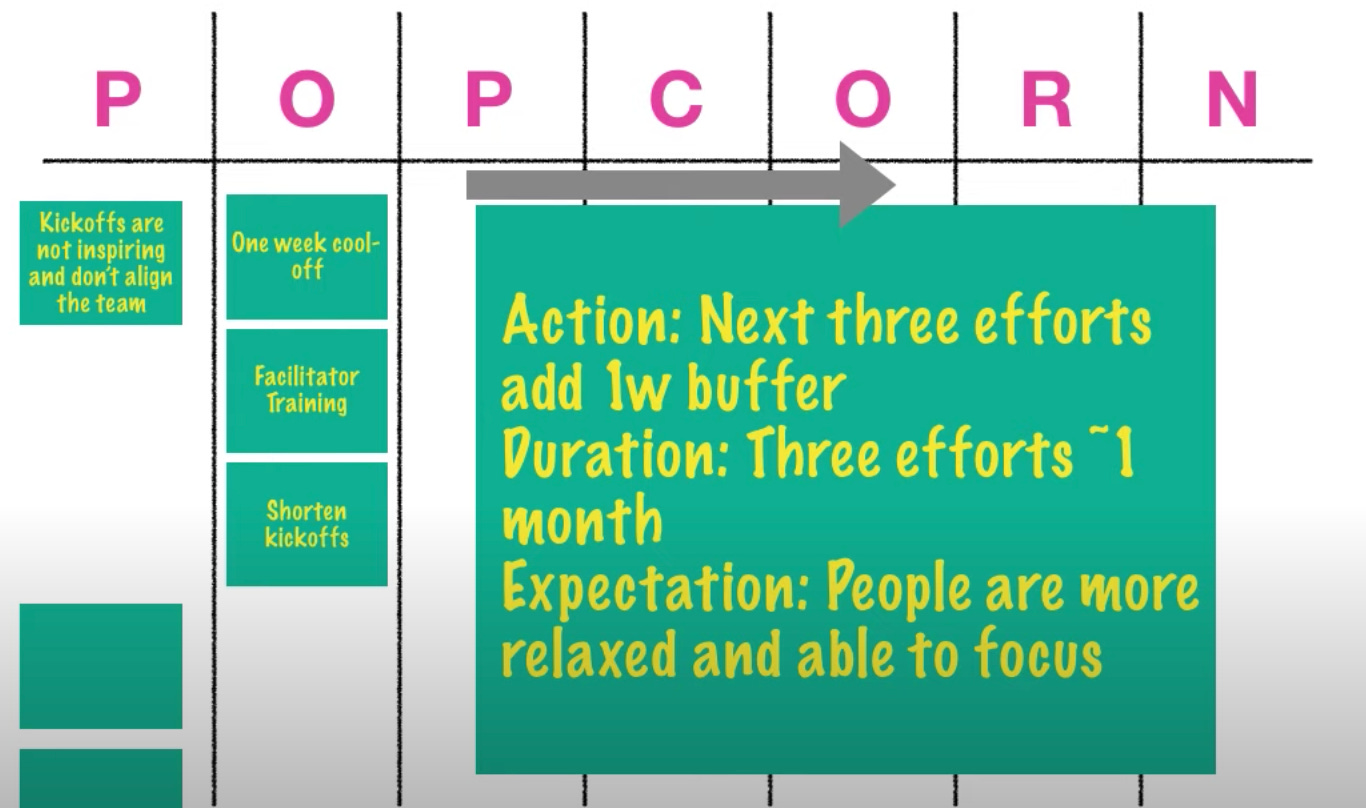 A great tool for this is called POPCORN Flow invented by Claudio Perrone. What does POPCORN Flow help you do? It is a lightweight structure and process for continuous improvement. It helps you limit change in progress. It inspires time-bound and specific experiments, after making sure you consider your diverse options. And it asks teams to inspect and adapt based on their experiments.