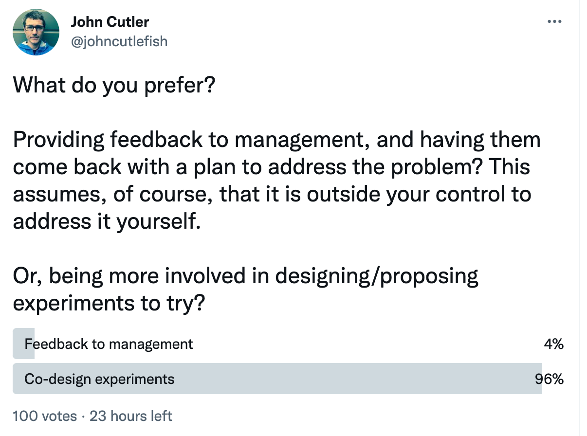 It would appear that things aren’t as simple as we think. People appreciate having input and being involved in designing and deciding what experiments to try. They also look to management to provide air cover and support AND to unblock things impacting the team.