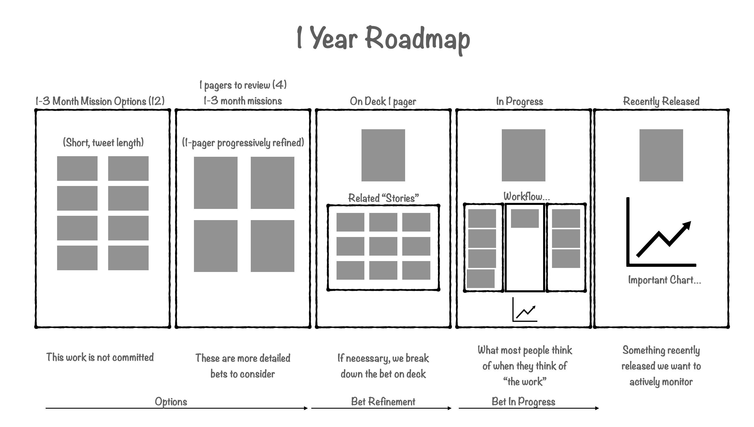 Every bet has a one-pager, a research folder, a learning backlog, a “core team”, and "extended team", and an advocate. Over time you will accumulate more “stuff”, so be sure to make it easy to find. Write a one-pager for bets in the 1-3 month range. For longer bets, make sure to break them down (but also have a 3-6 pager for the big "parent" bet) .