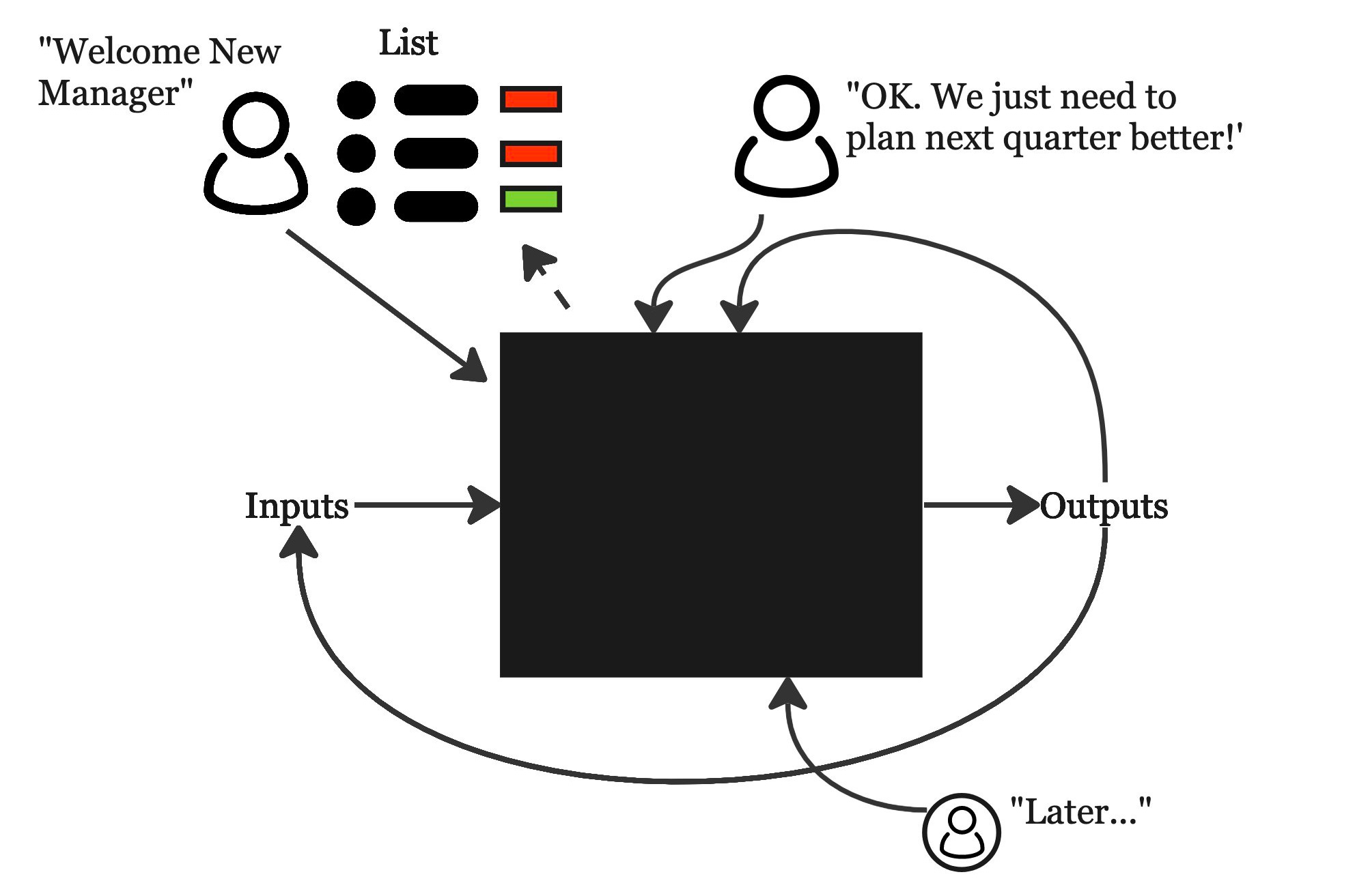 Say the team reactively addresses quality issues. This creates more “work” (the output inputs into the input), but it also leaves the team more burnt out and they make less-good decisions on whatever is going on in the box.