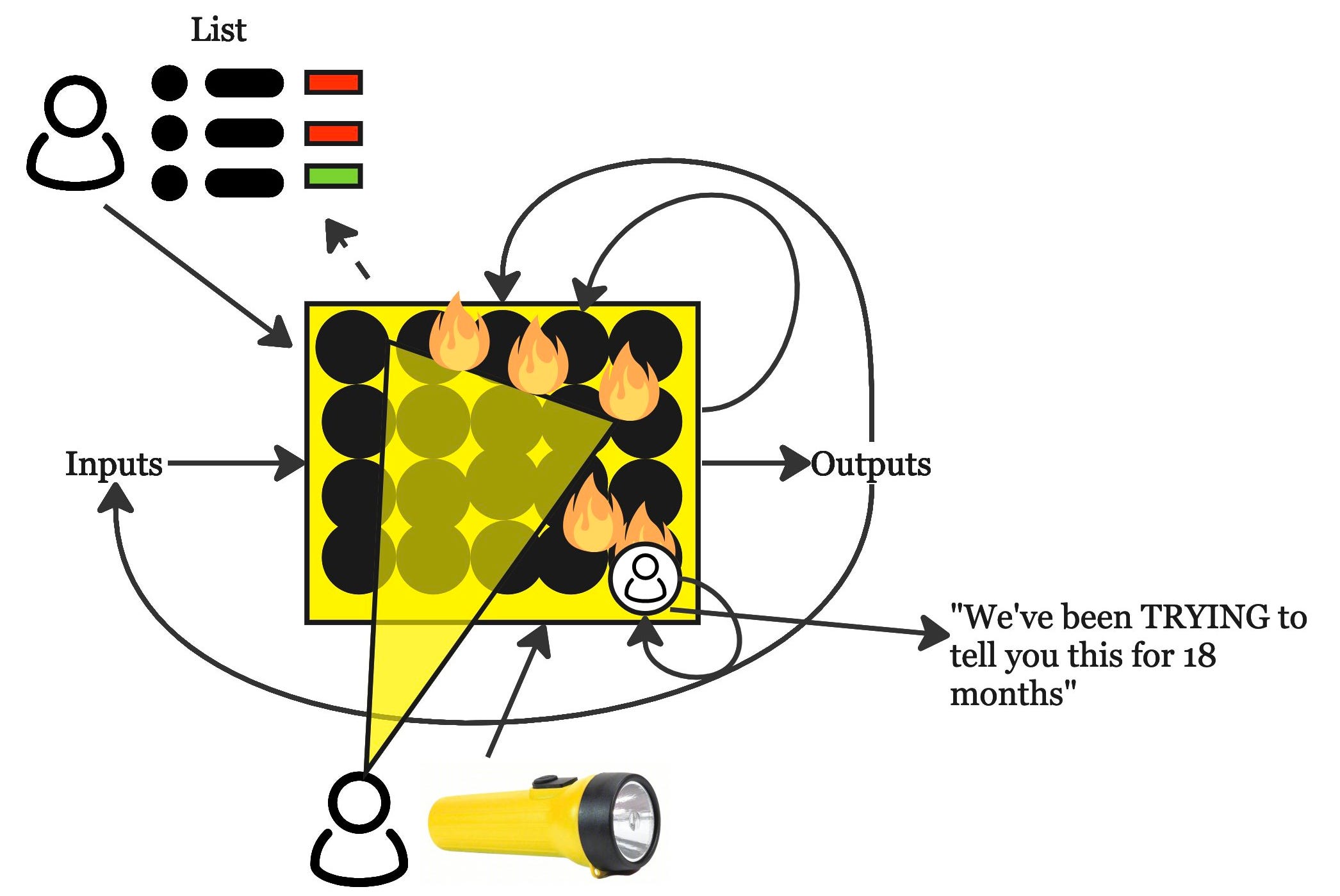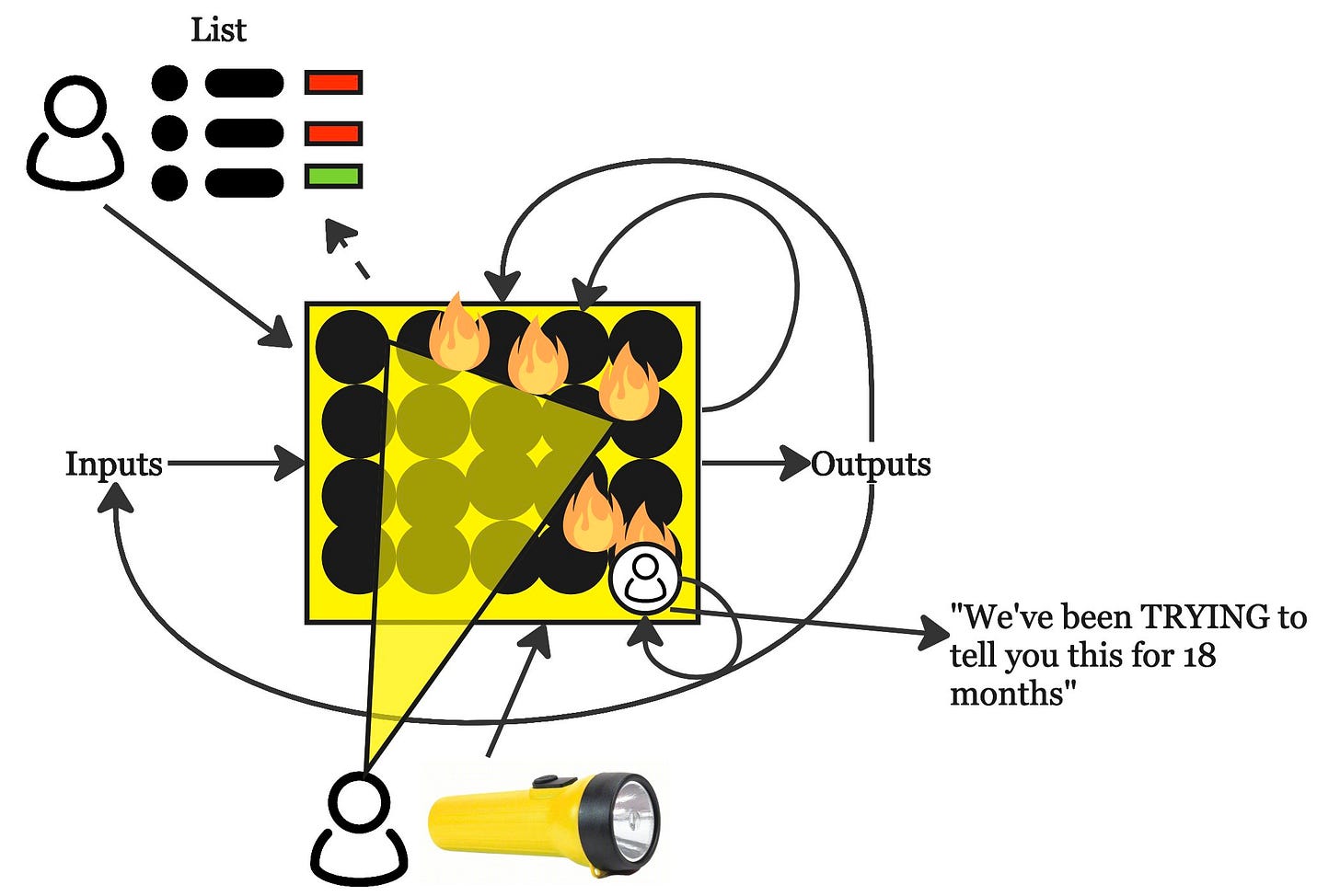 First, this is another input into the box (which isn’t a black box anymore), and that adds stress. When people see what is inside the box, they find it incredibly overwhelming. Seeing the mess causes high cognitive load, which creates yet another input into the box. The people in the box have been saying this for 18 months, and no one ever really listened!