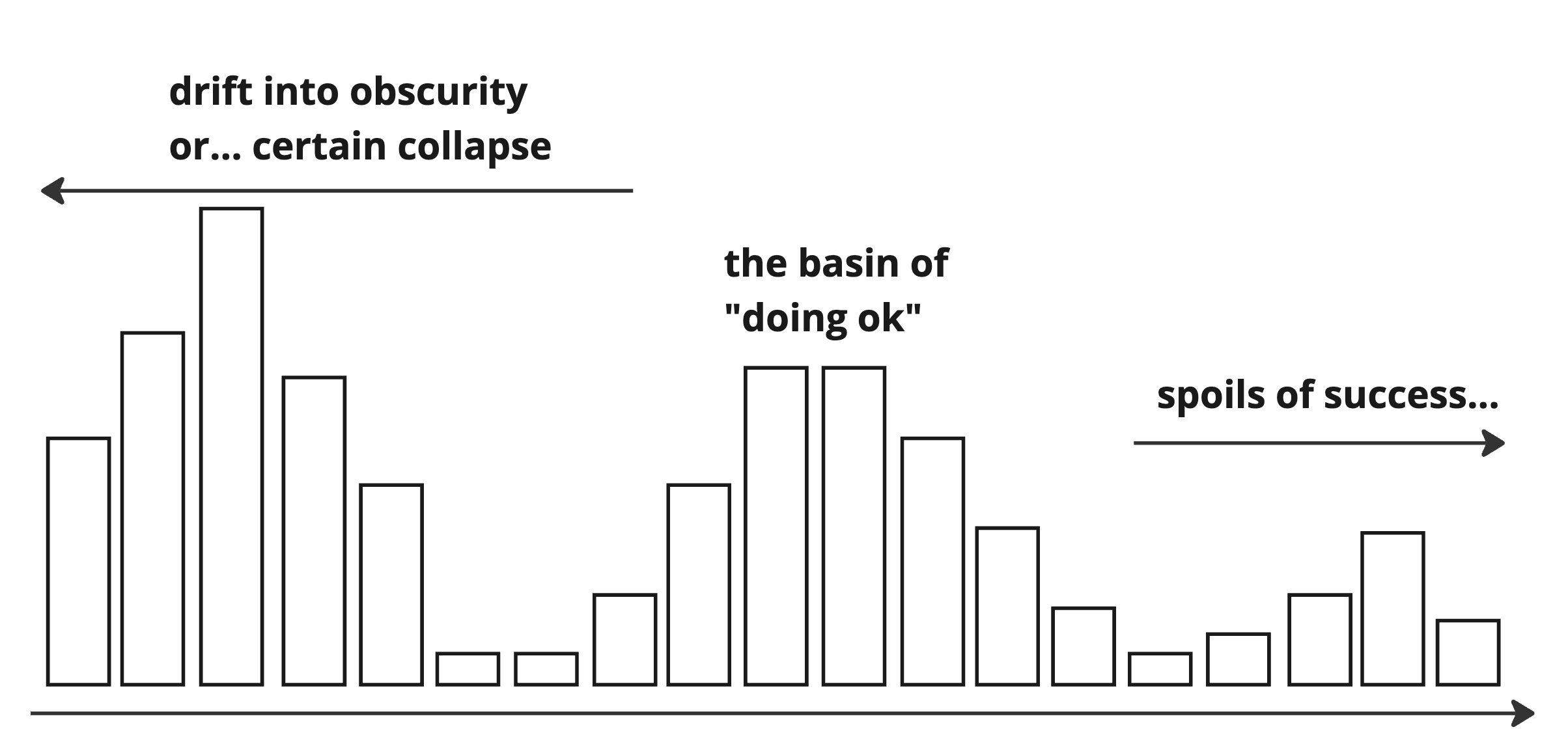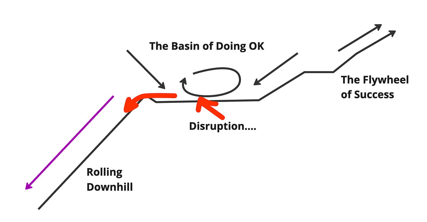 Some % of companies are either collapsed or are on their way down. Meanwhile, a smaller % of companies are enjoying the "flywheel of success". They are getting better and improving. This leaves some companies in the "doing OK" basin. They aren't improving, but they also aren't failing. Stay long enough in the "doing OK" basin, and you will start your drift into obscurity, but it can take a while.