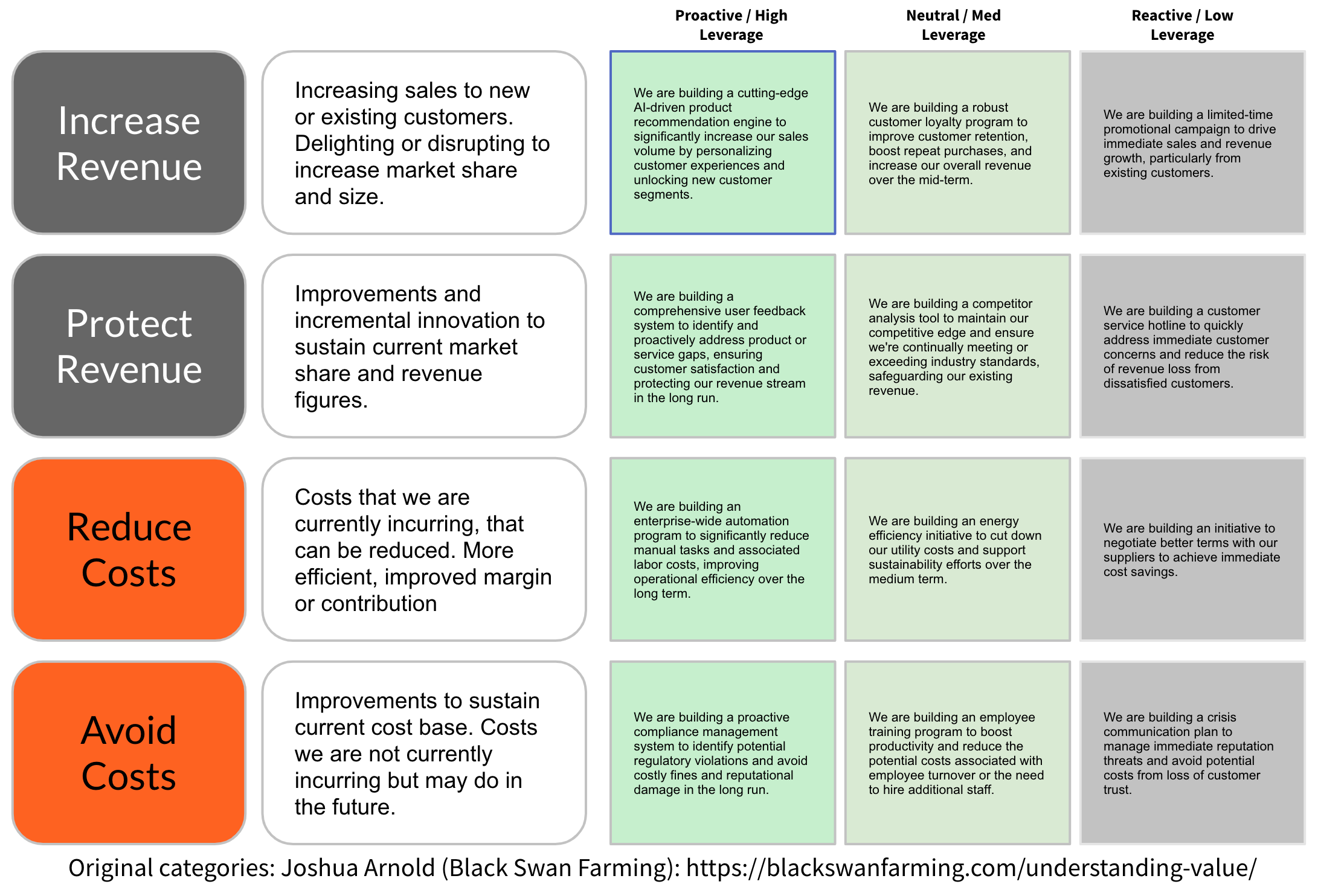I’ve always loved Joshua Arnold’s article Understanding Value. Arnold’s article describes four “benefit types”: increase revenue, protect revenue, reduce costs, and avoid costs. It is especially relevant, given that many companies are trying to simultaneously focus on increasing revenue, retaining cost-conscious customers (protecting revenue), and reducing/protecting costs. You can’t just focus on increasing revenue.