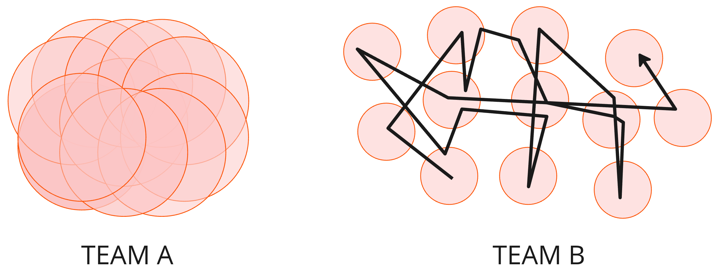 Team B is likelier to expend energy rapidly shifting and translating between frames. "Why are we doing this again?" "How does this map to our goals?" "Who knows about that?" "Who owns that service?" “Why don’t the priorities mean anything?” “Why did we keep saying X, but doing Y?” Hop, hop, and hop.