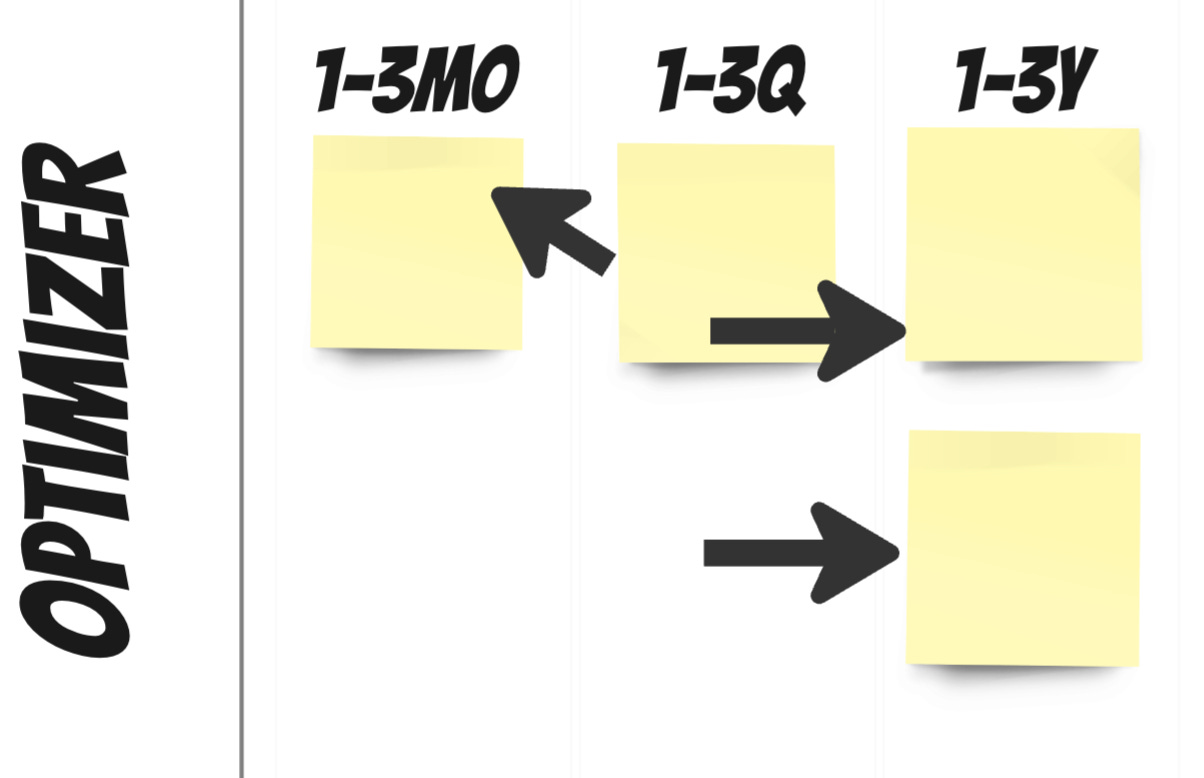 I turn whatever they have into a 9-box and divide each cell into three columns: 1-3mo, 1-3q, and 1-3y. Then, I instruct the team to place the initiatives in one of the three columns FOR THE CURRENT CELL. No moving around to different cells. It looks a bit like this: