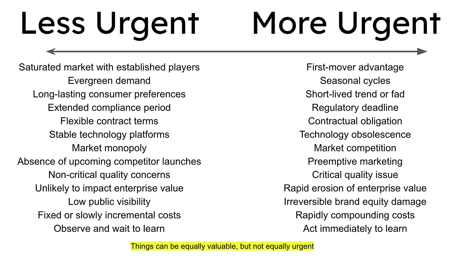 First, I ask the team to organize their initiatives based purely on urgency—one axis, not two. I describe the many scenarios where urgent things aren't necessarily valuable, and valuable things aren't necessarily urgent. I stress that questions of urgency—when to enter a market, when to care about competitors, near-term risk vs. long-term risk—are inherently strategic.