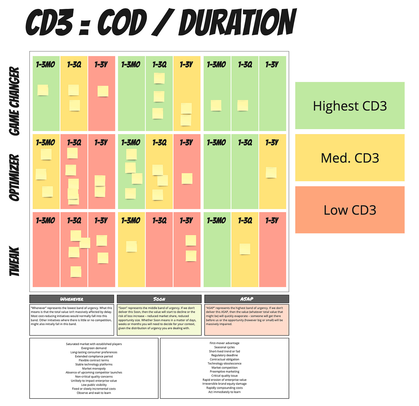 Notice what’s happening? Something can be Soon + Game Changer + 1-3y, and that is equivalent to ASAP + Optimizer + 1-3Y. Both should be sequenced after anything in green (Highest CD3).