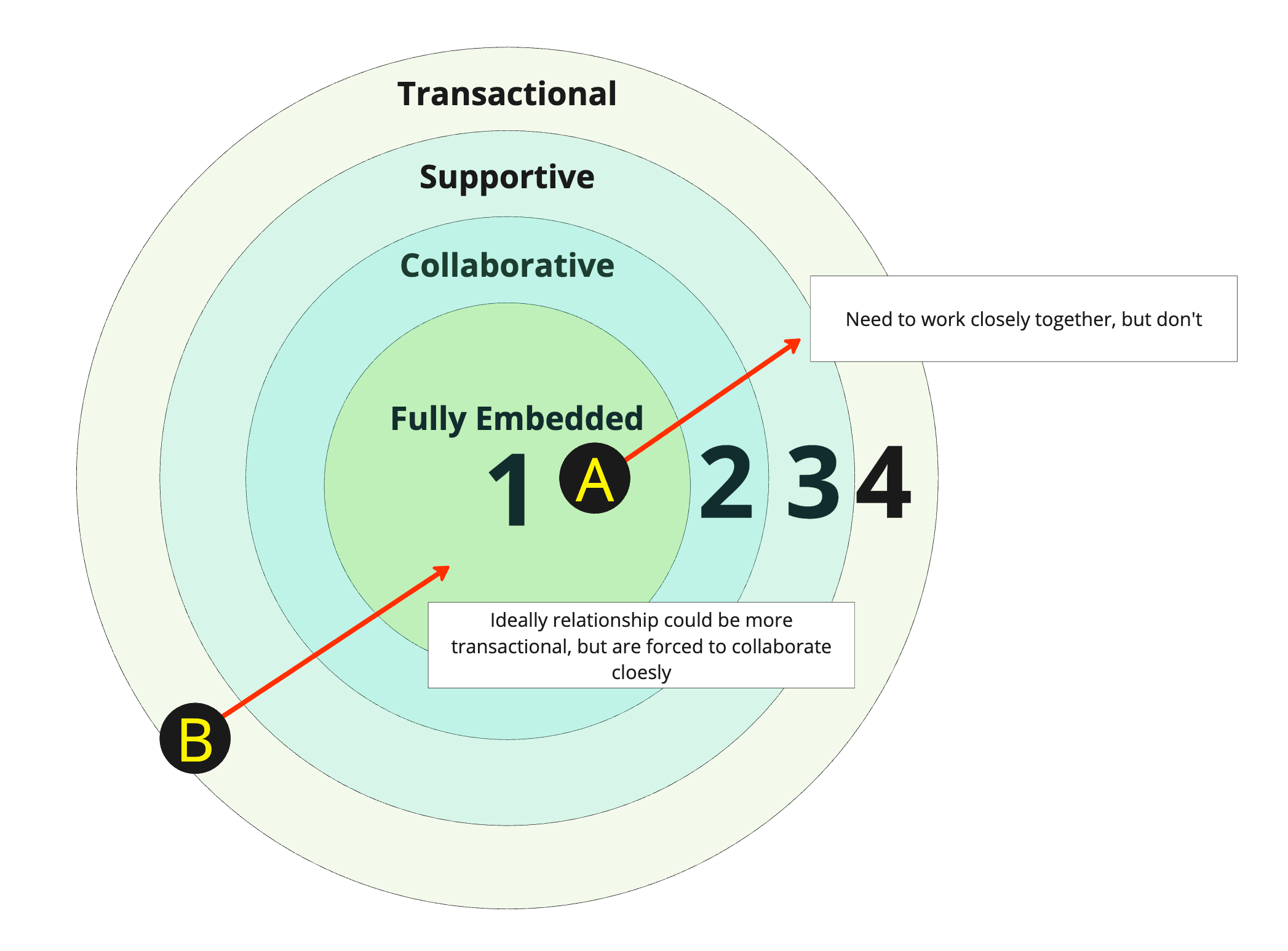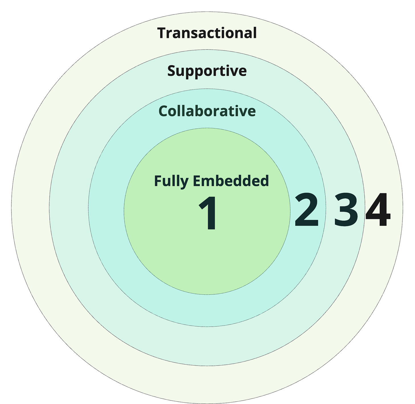 Throw in two ways of working in the middle. We now have Fully Embedded, Collaborative, Supportive, Transactional. We can visualize this as a series of overlapping circles with some categories between the max and min described above.