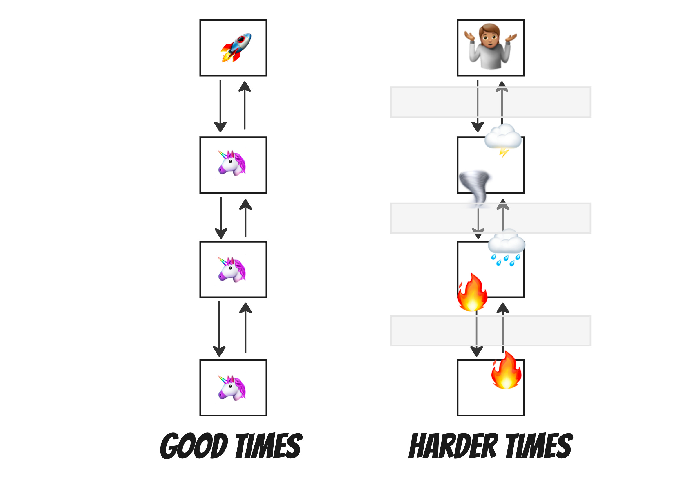 During high growth and low-interest rates, companies scaled up and out rapidly. They added layers, groups, and products. Because things were going reasonably well, there was little emphasis on defending and detailing tradeoffs. Instead of answering the question, "So what are we getting for all this money?" there was a lot of answering the question, "How much money do you need, and how many people will you hire?"