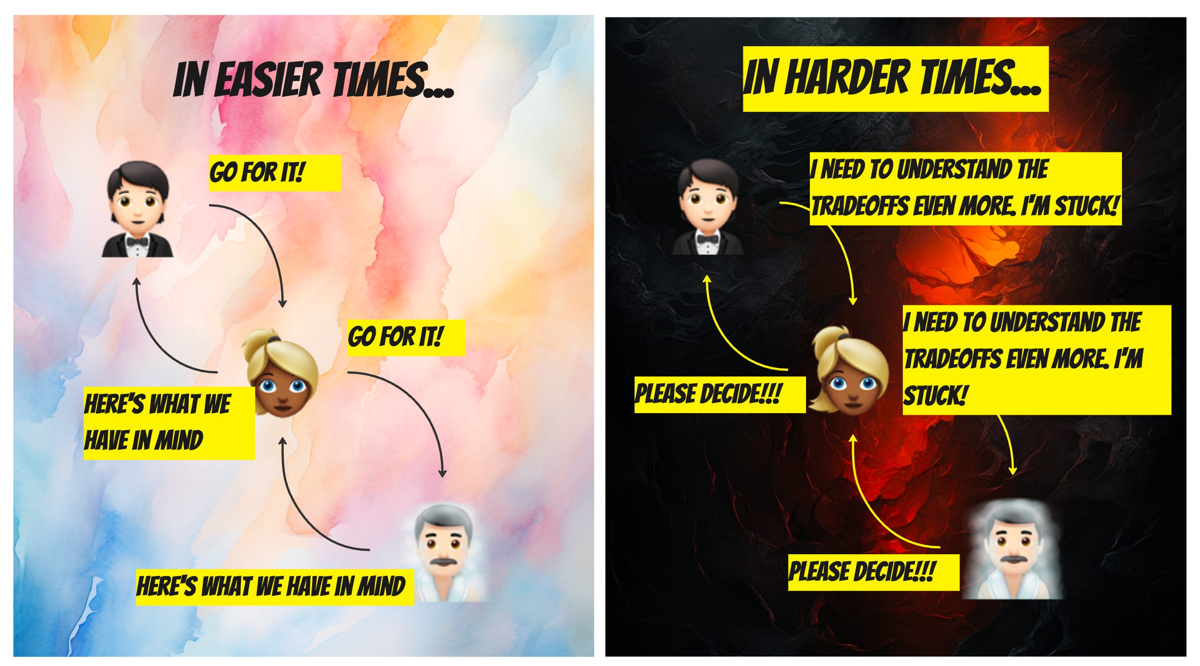 In good times, it was go, go, go. In harder times, leaders feel pressure to make a lot of fine-grained tradeoffs and hyper-optimize allocation. Meanwhile, teams on the front lines desperately want someone to decide! Any decision, even.