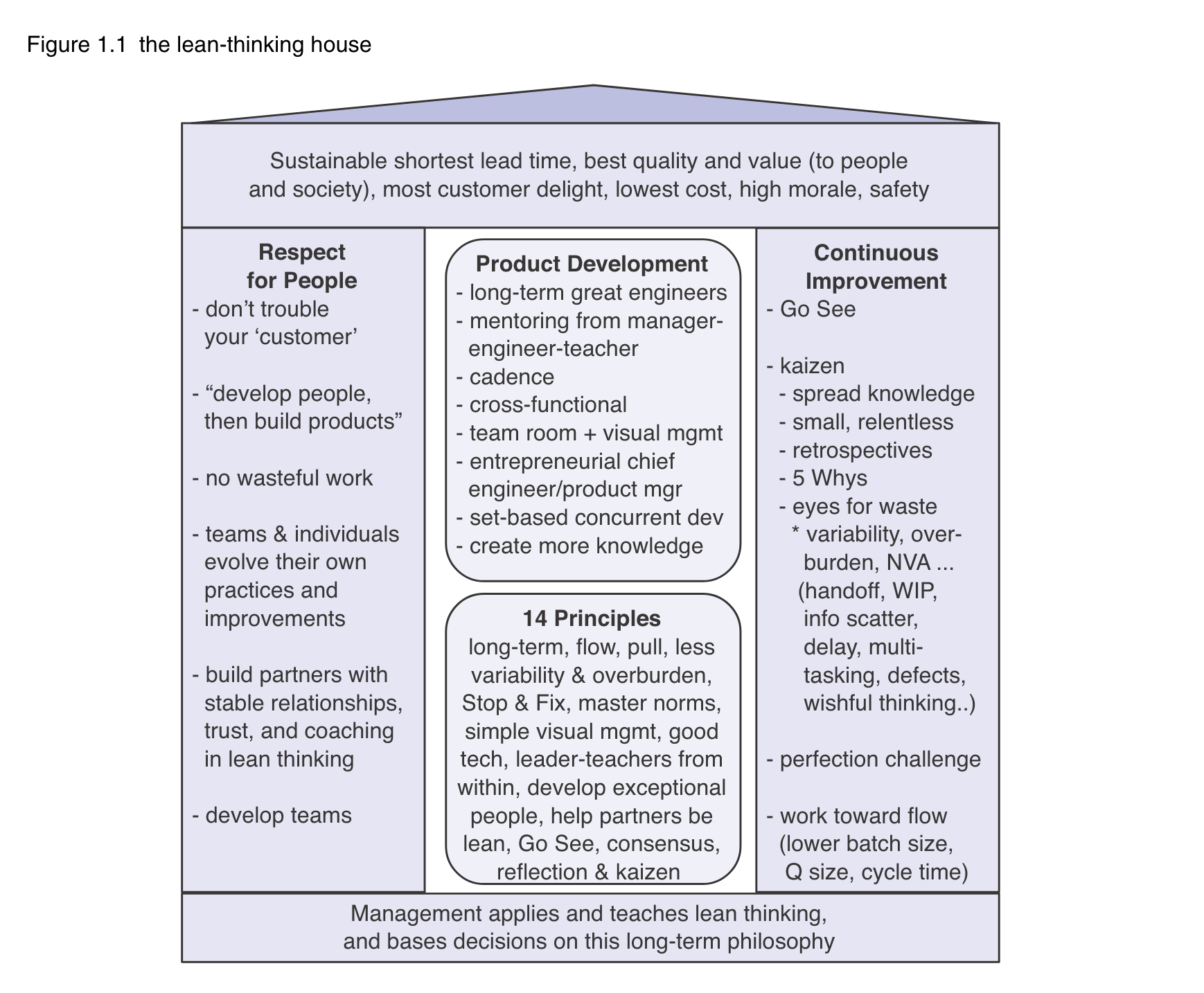 I have always loved this diagram by Bas Vodde and Craig Larmen from their Lean Primer (Version 1.6). I love how it communicates principles, practices, goals, and beliefs. Respect for People and Continuous Improvement are the "pillars".