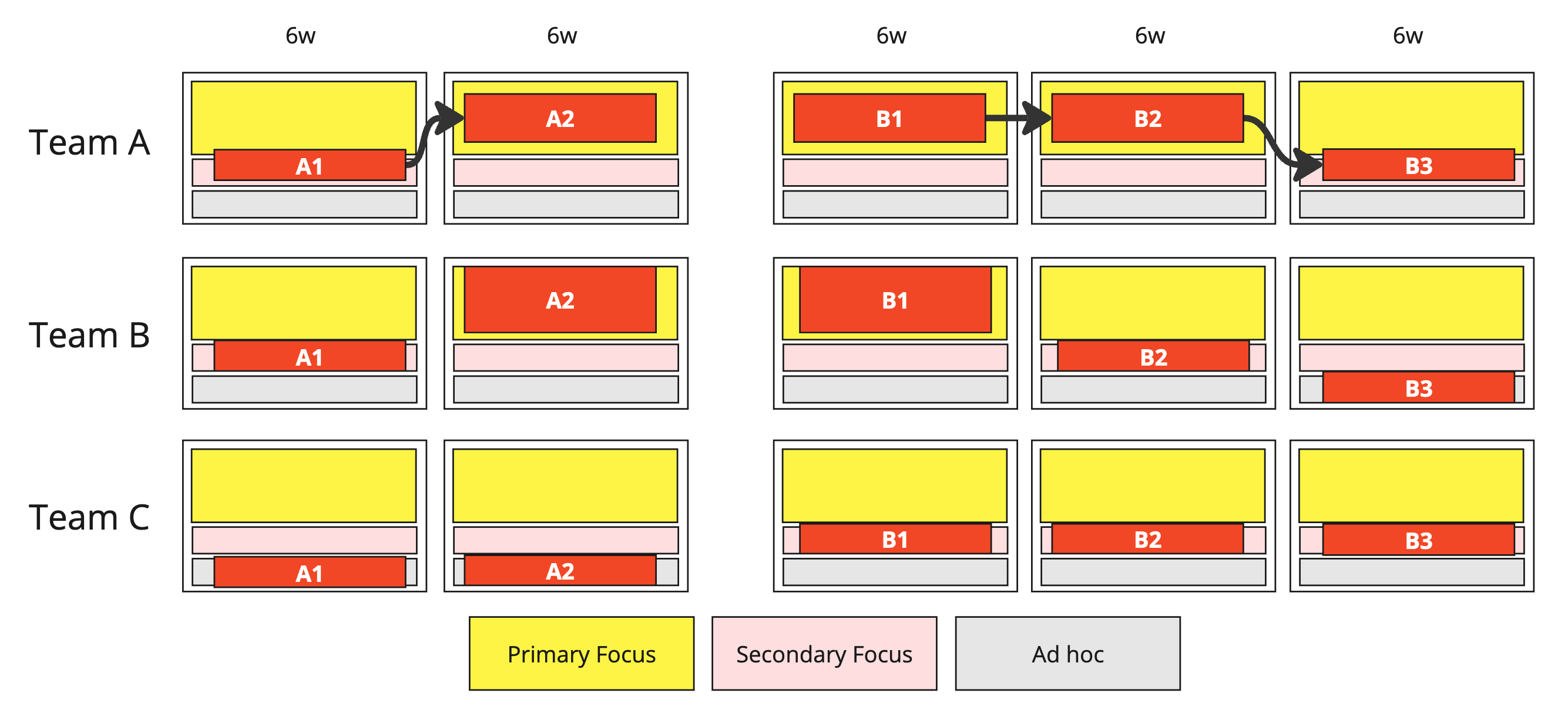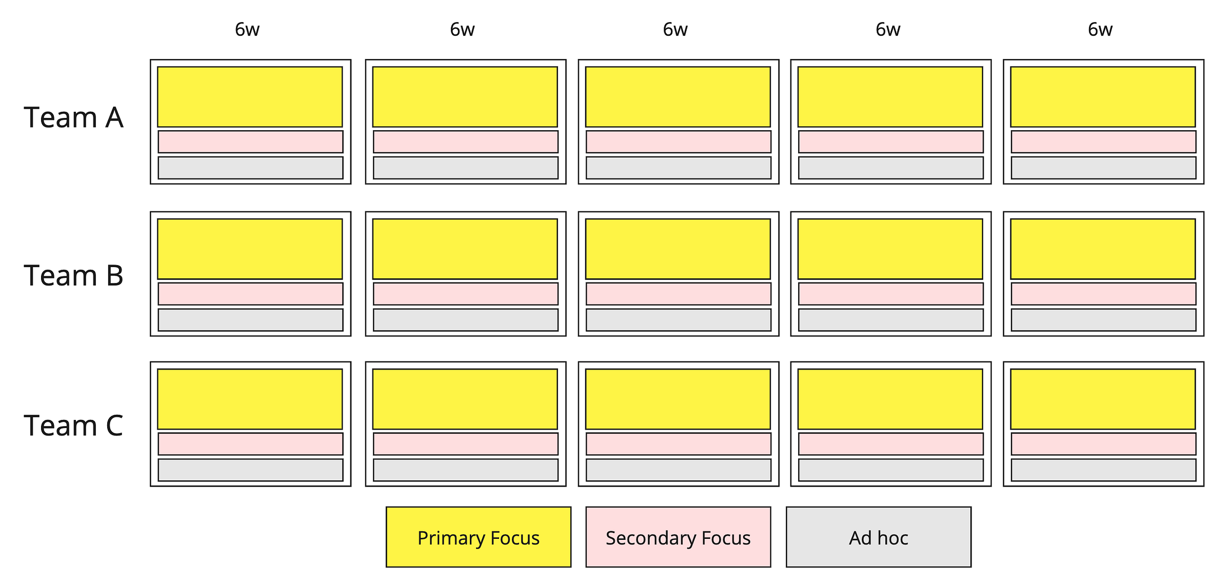 Here is an alternative approach. Imagine I have three teams working in six-week cycles. Every team has three “slots” for focus: their main focus, their secondary focus, and some slack set aside for “ad hoc” work.