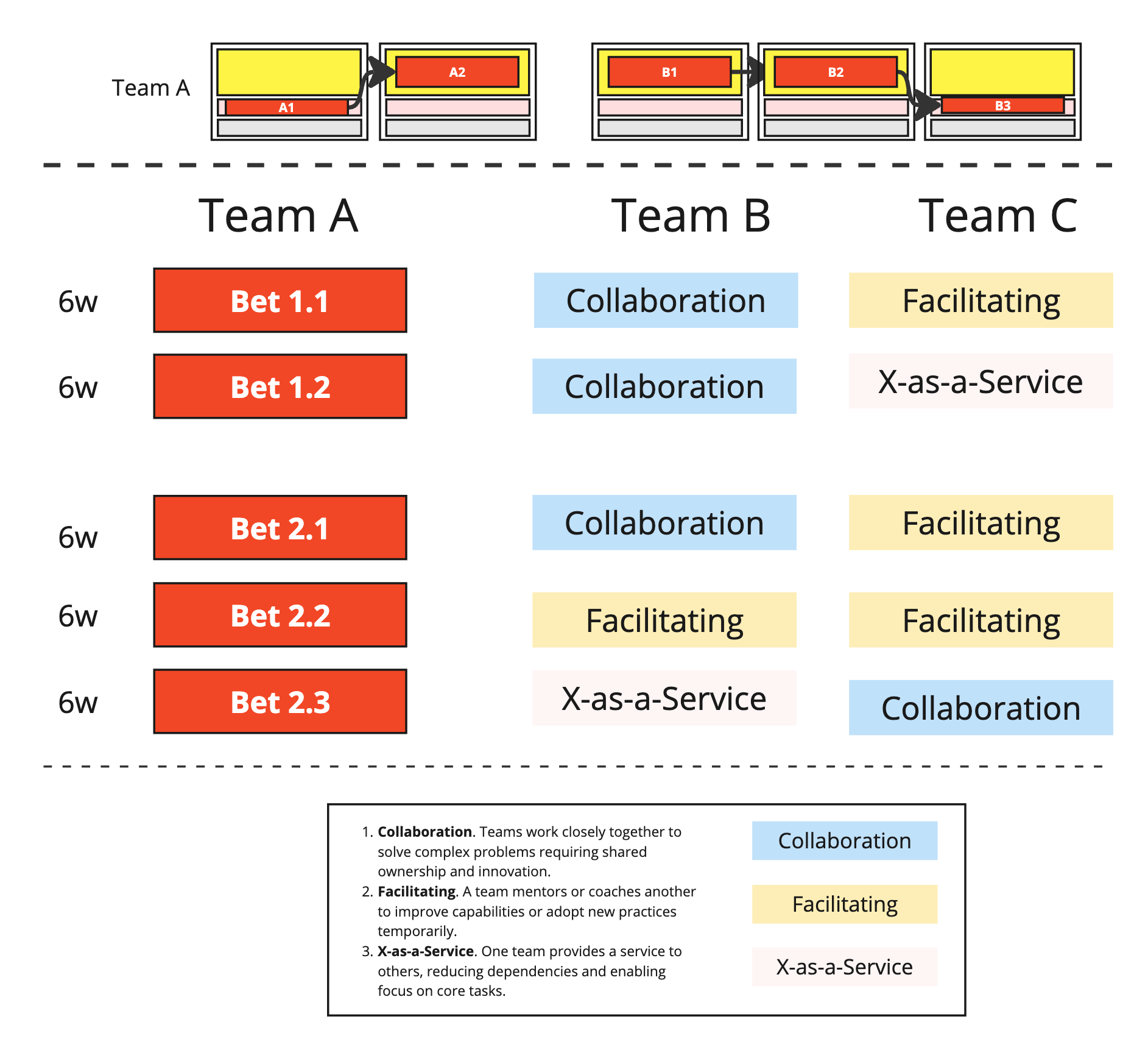 Picture that Team A has two multi-bucket bets (with opportunities for continuous delivery and experimentation, of course). Team B and C don’t worry about figuring out every detail of the bet. Instead, they focus on collaboration patterns.