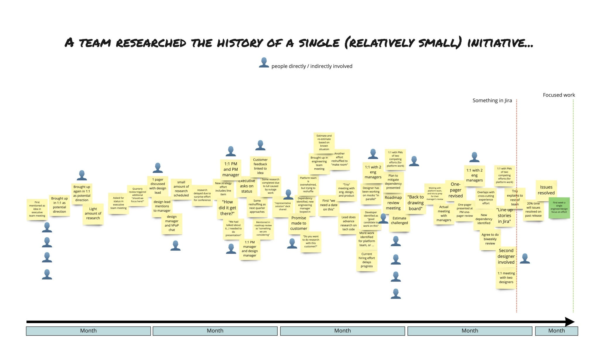 Periodically do retrospectives on the full history of an effort, from the initial idea (or request or strategy) all the way through to customer and business outcomes. Who was involved? What was collaboration like? Many leaders lose sight of what it actually takes to get work done in a company. It's important to surface this without judgment.