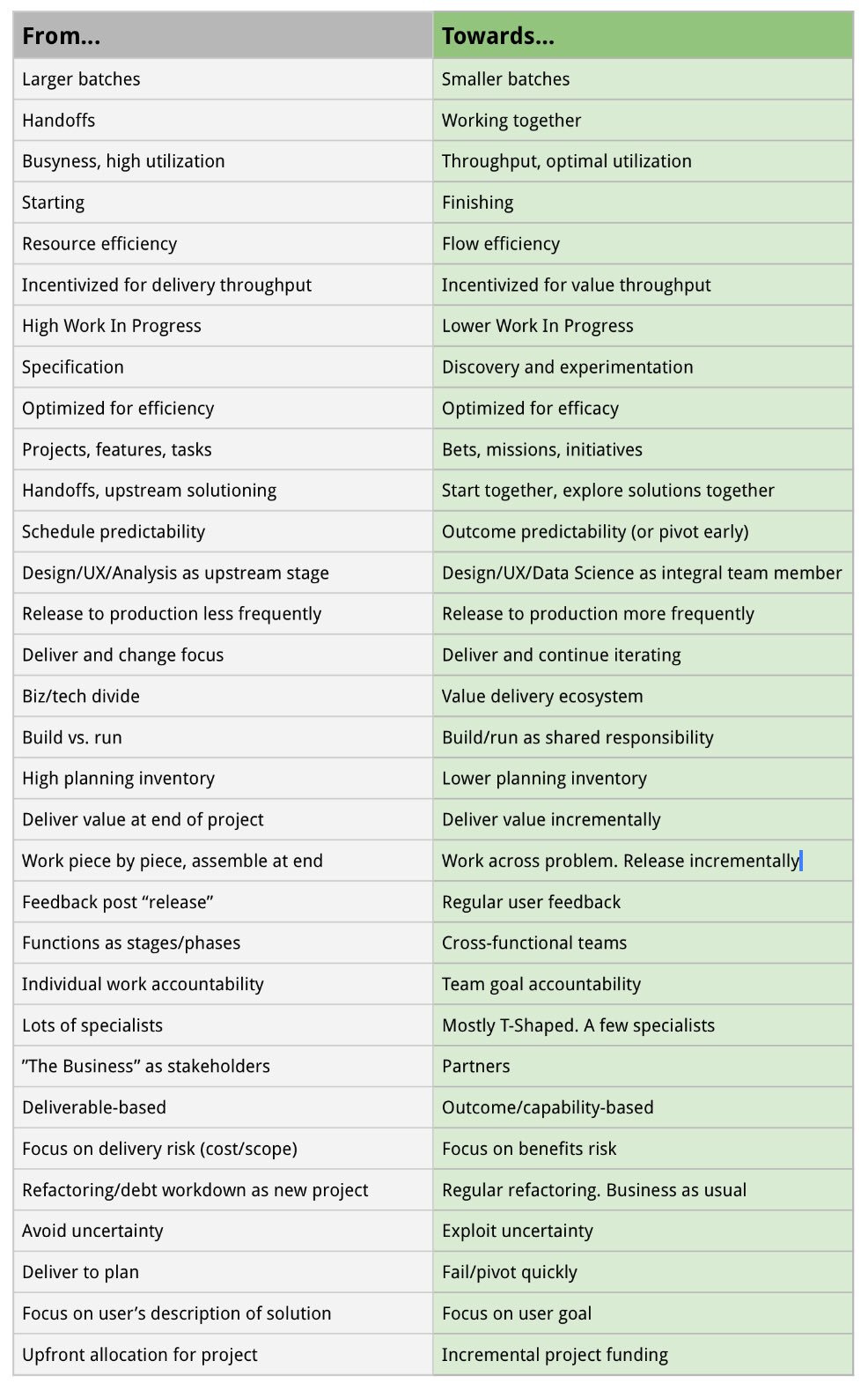 A table I put together a while ago that I refer to often. When looking at what Company X does, ask how it supports the shift from left to right: