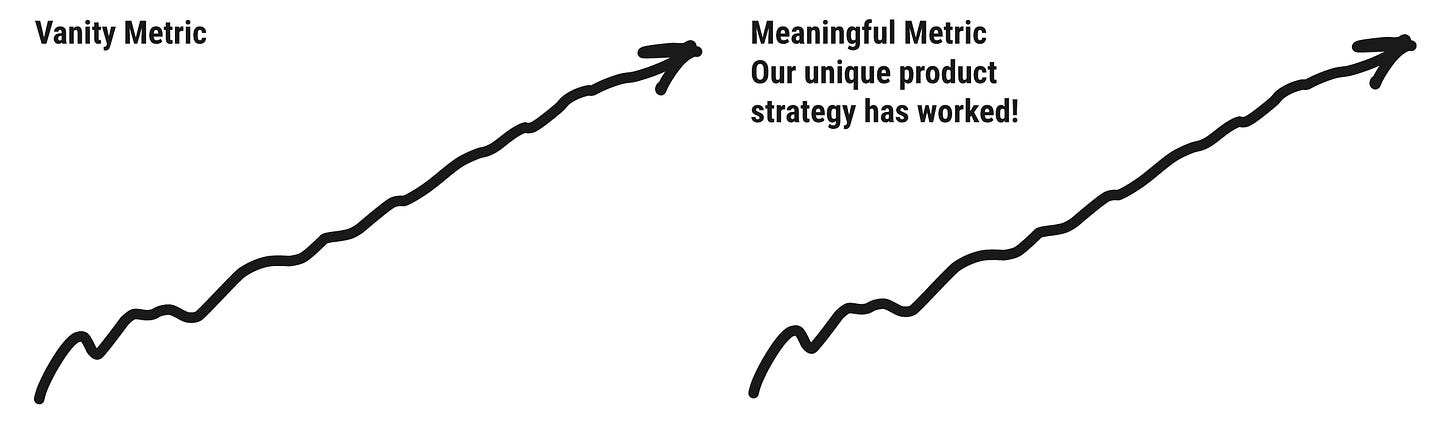 I show an image of two hand-drawn charts. One labeled Vanity Metric. And one labeled Meaningful Metric.