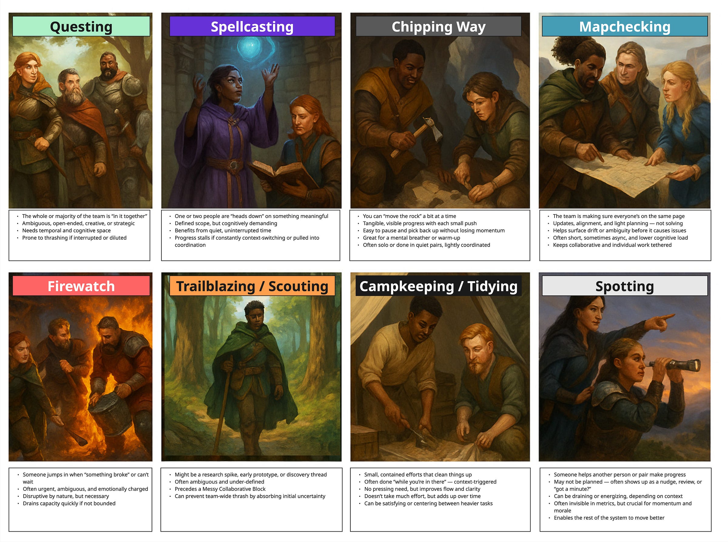 When you put it this way, it’s easy to see why teams get overwhelmed. Imagine if you’re on a Quest and you’re putting out a lot of Fires. That could be your whole week, done. But maybe you’re in a mode with one person Spellcasting, another Chipping, while others are Questing, and maybe someone is Trailblazing. You’re doing more at once, but the shapes of your actions are a lot more complementary.