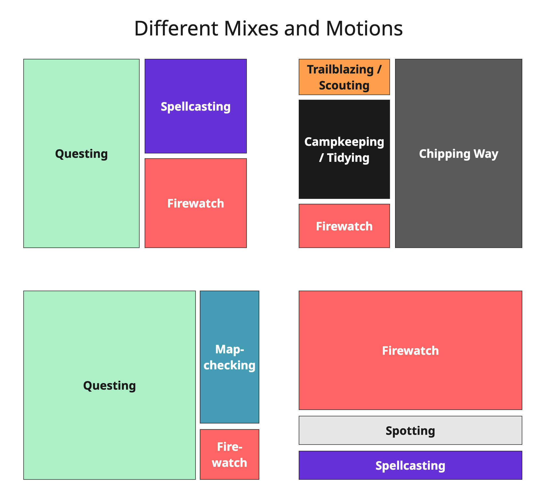 I got a little carried away with the naming here, but think about the difference between Questing with your whole team, in it together, on an open-ended mission, and Chipping away at something you can always come back to, where you can “move the rock” a bit at a time. Or Spellcasting — summoning all of your focus alone or with one other person, completely heads-down, allergic to any interruption — versus being on Firewatch.