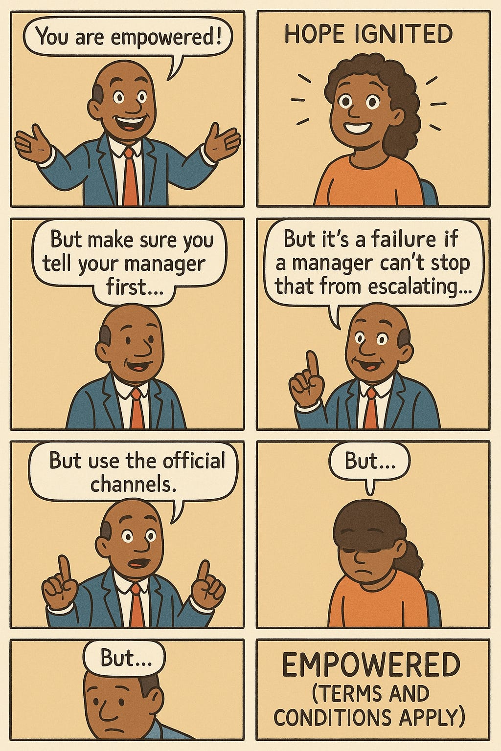 By contrast, tech often adopts the language of mission command (e.g., autonomy, empowerment, intent) without investing in the hard infrastructure of trust, shared context, and safety necessary to escalate. Which leads to: