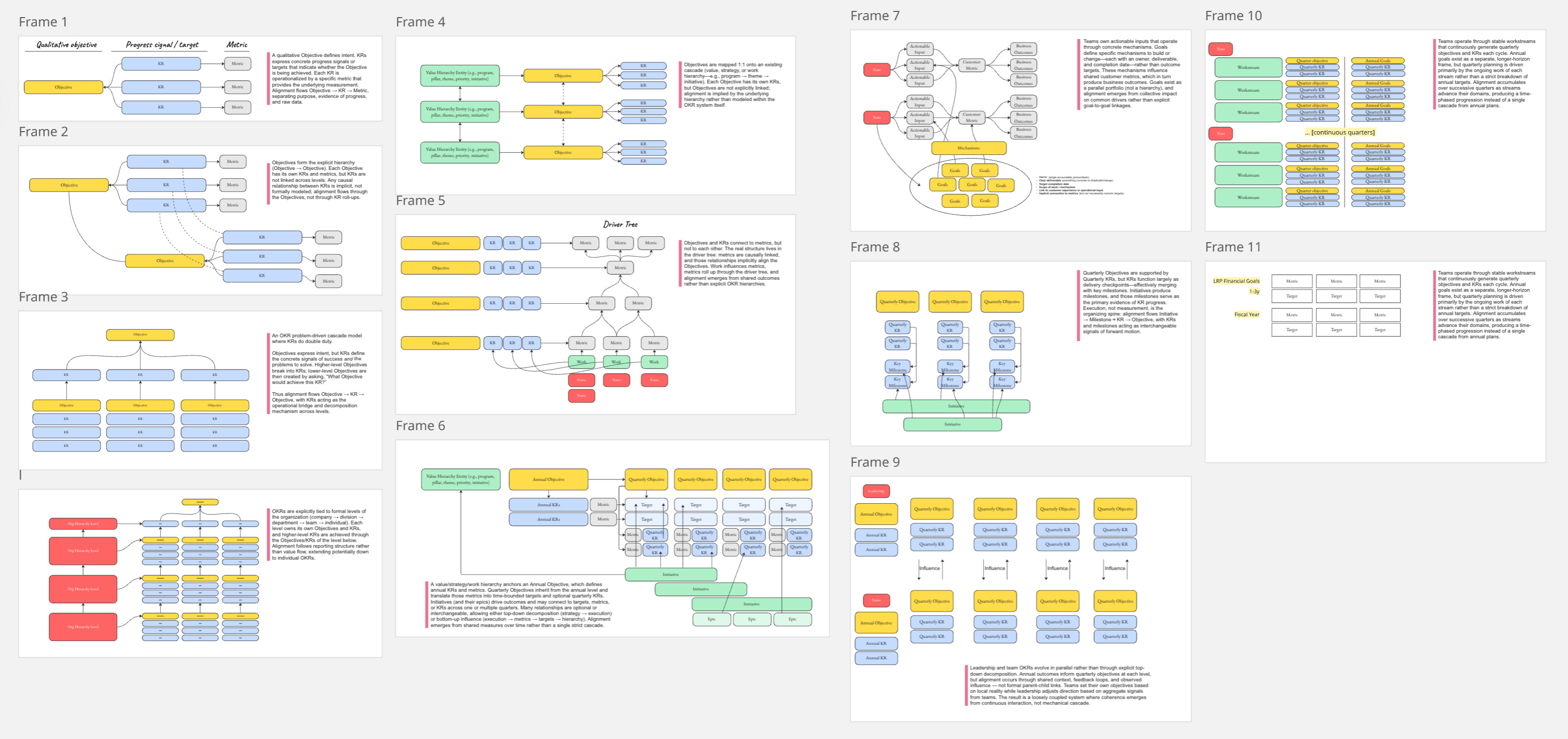 In Dotwork, we’ve started cataloging the different patterns we see in customer environments. The diagrams above are all “OKRs,” but the structures are fundamentally different.