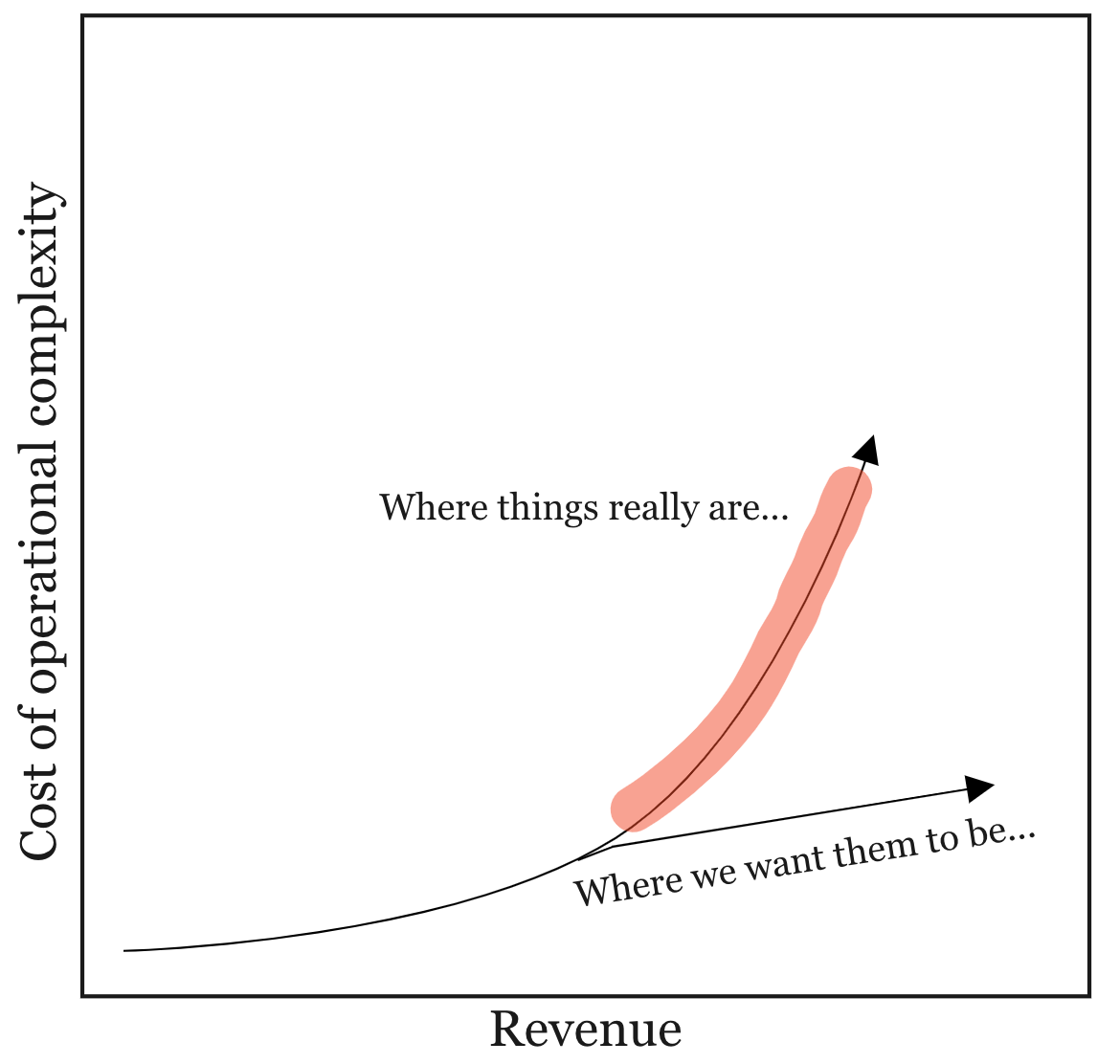 But what if your operational cost structure changes as you attempt to grow revenue? Differences matter. The range here is vast between companies offering multiple products at almost no incremental extra operational complexity and those where costs (the cost of operational complexity) shoot up exponentially.