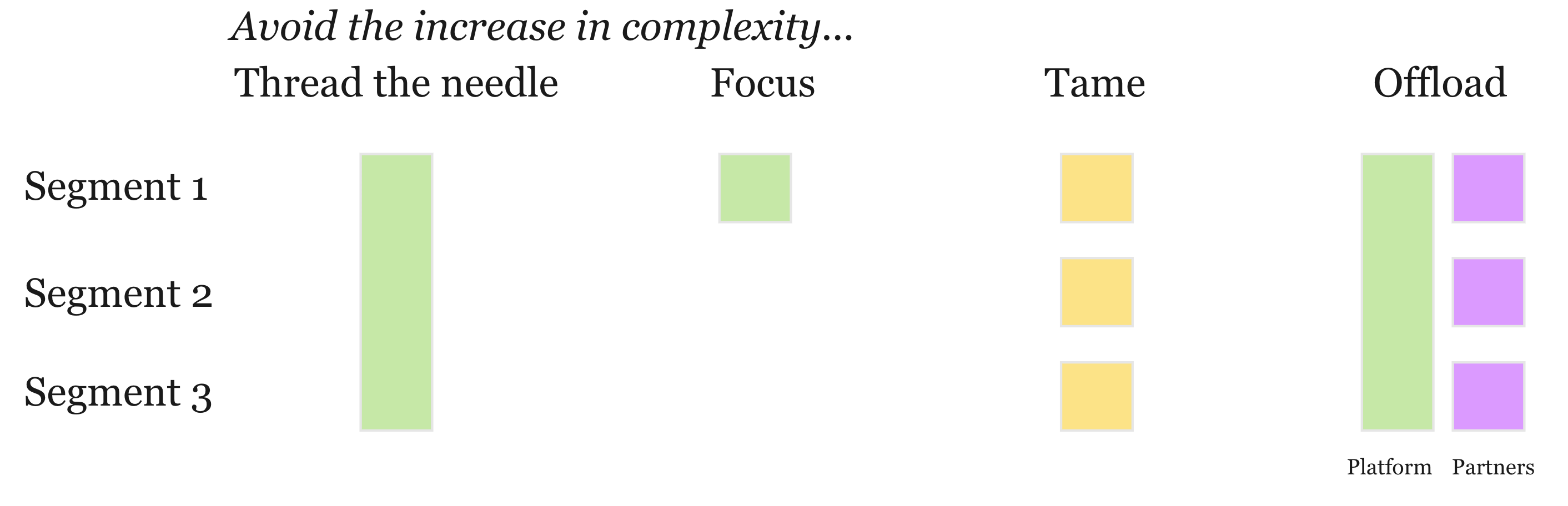 Let's return to avoid. I presented two avoid options: focus and thread-the-needle. Viewed alongside Tame and Offload, they might look like this: