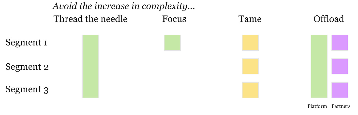 Product might opt to build a platform that pushes some of the complexity externally for unique use cases. GTM (and product) might choose to expand their partner network and integration ecosystem. Both attempt to shift operational complexity elsewhere (and can be highly effective or flop).