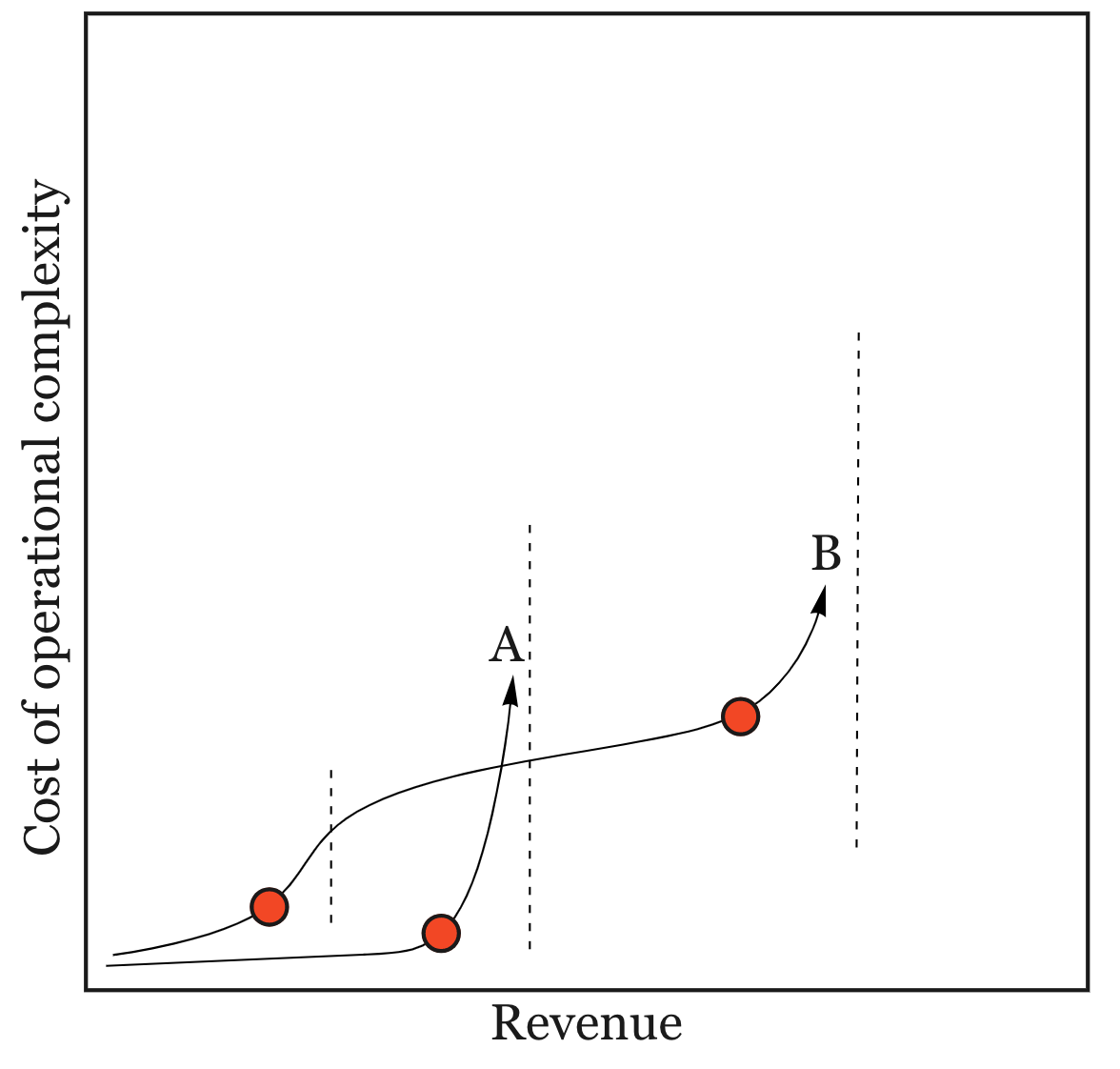 Company A grows rapidly, selling to one segment of customers. Everything is roses until it attempts to sell to a NEW customer segment. The cost of operational complexity rises very sharply. This is when many startups flame out or get acquired.