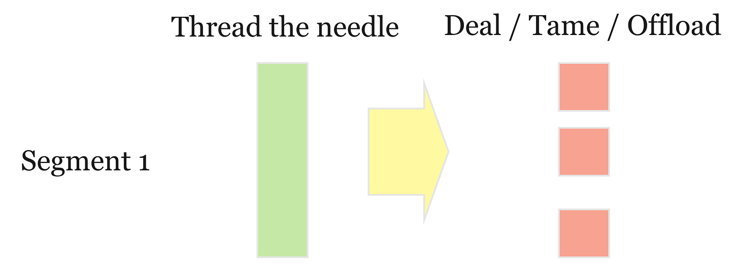 A danger of "threading the needle" is that we start to believe there is only one segment when there are many segments! What if that reality changes over time? What if the differences become accentuated or impact future growth? Then your only options will be to deal, tame, or offload (or focus and leave some customers unhappy).