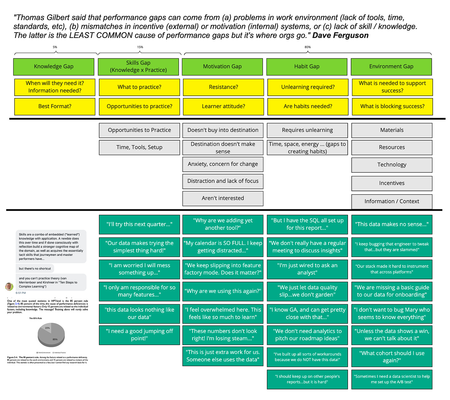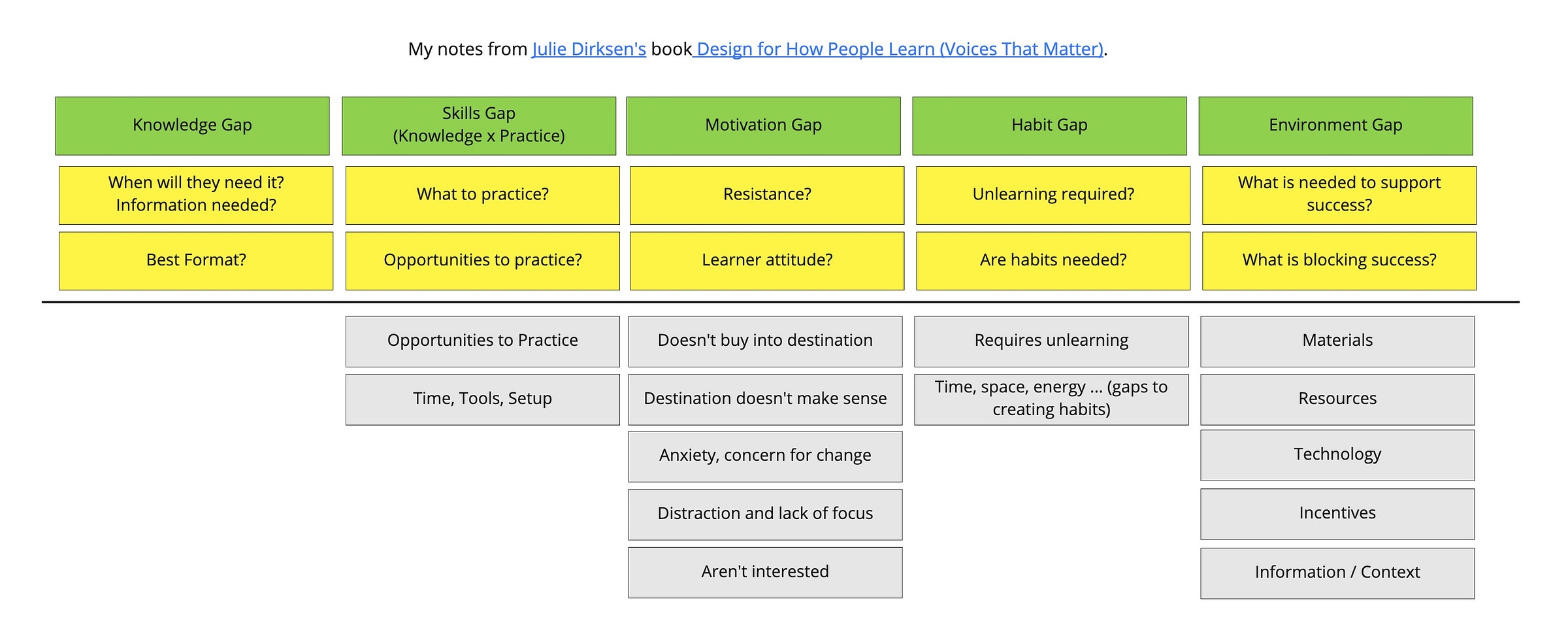 In the insightful (and accessible) book Design for How People Learn, Julie Dirksen covers five "gaps" that inhibit learning (and applying) something new: