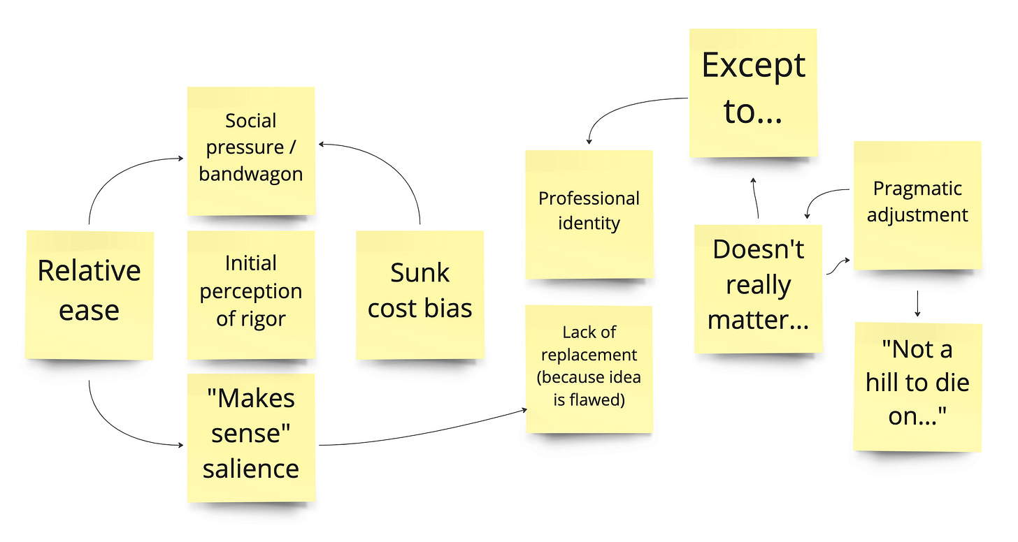 Let's consider some of the themes above: perceived ease, salience, social pressure, competitive pressure, sunk-cost bias, professional identity, pride, the allure of simplicity, inertia, perceived rigor-meets-simplicity, and lack of "equal" options. Any of those in isolation is powerful. Together, it is a potent soup!