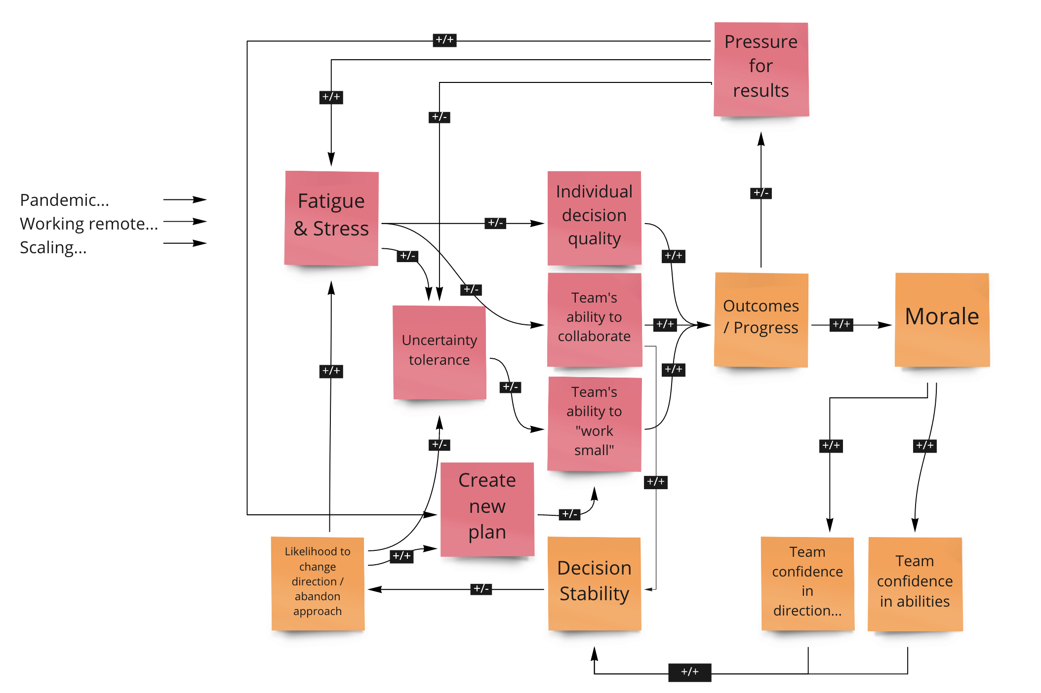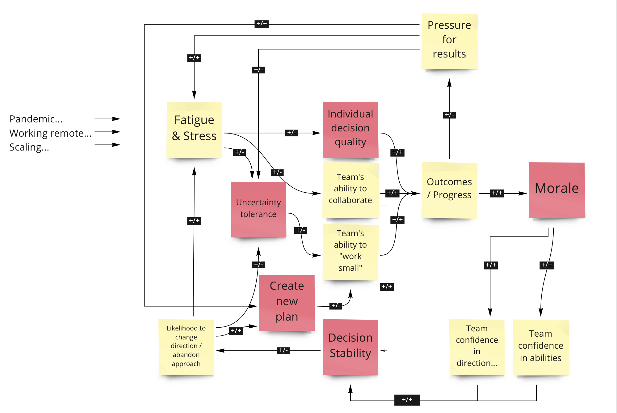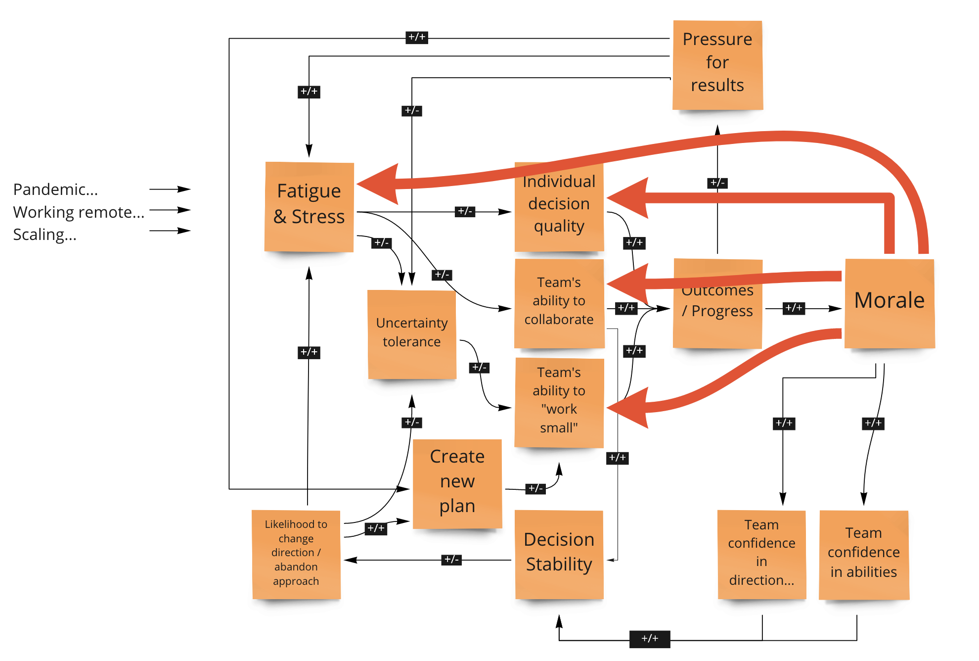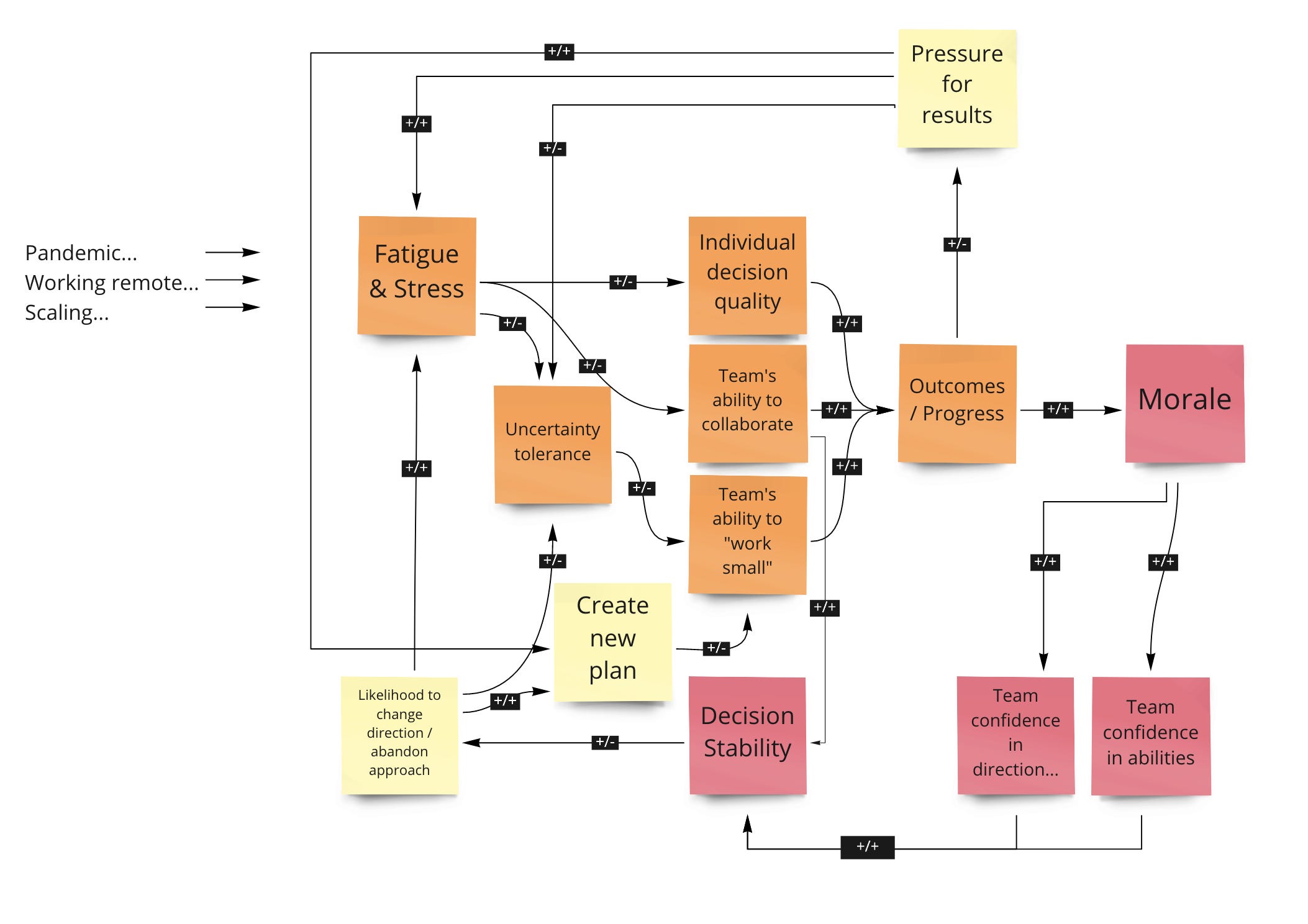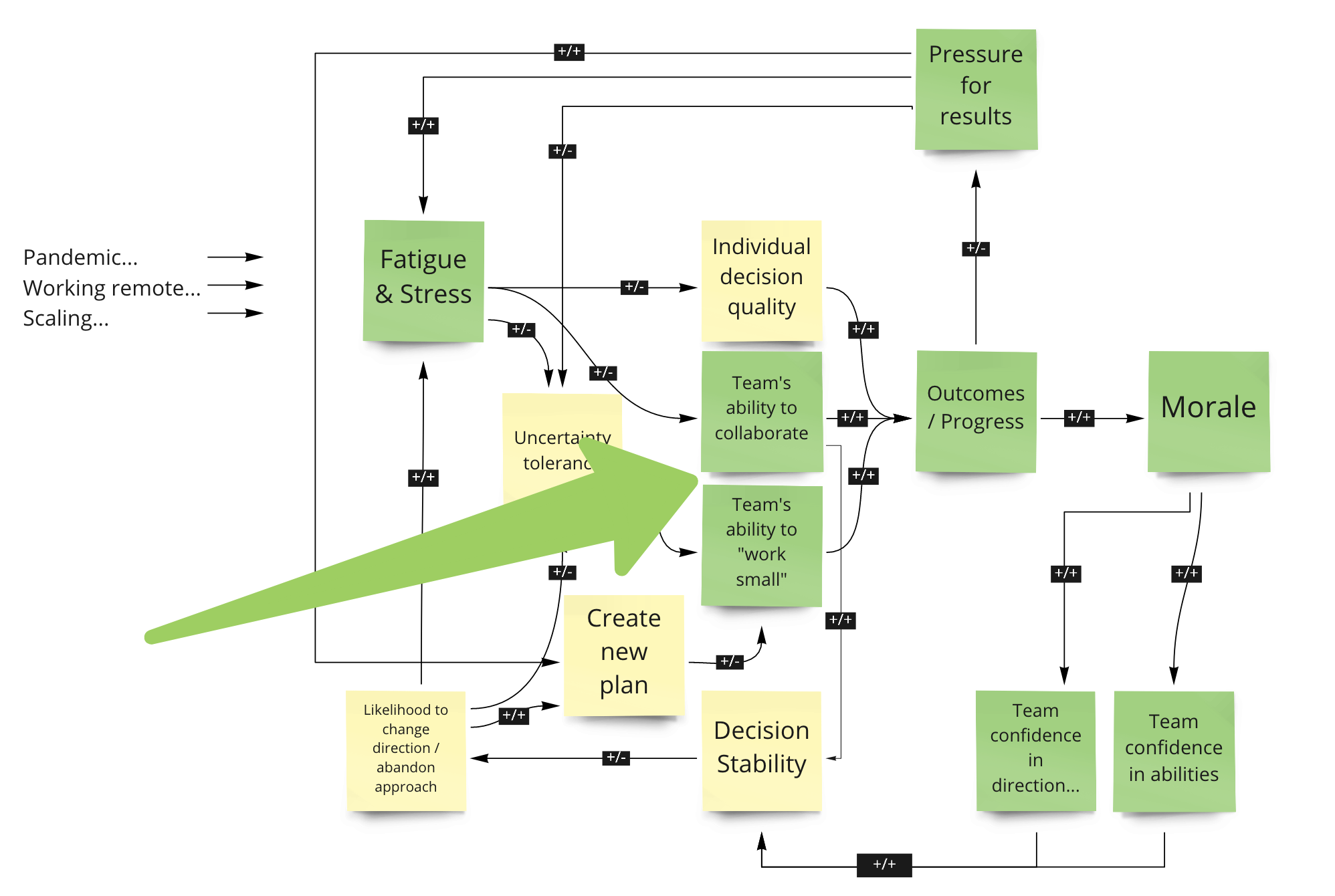 The drop in decision stability increases the likelihood that the team will abandon the current approach. This kicks off 1) the creation of a new plan, 2) further fatigues the team, and 3) makes the team even less tolerant of uncertainty. The new plan — combined with lower tolerance for uncertainty — is more likely to erode the team’s ability to work small. But…it feels completely intuitive.