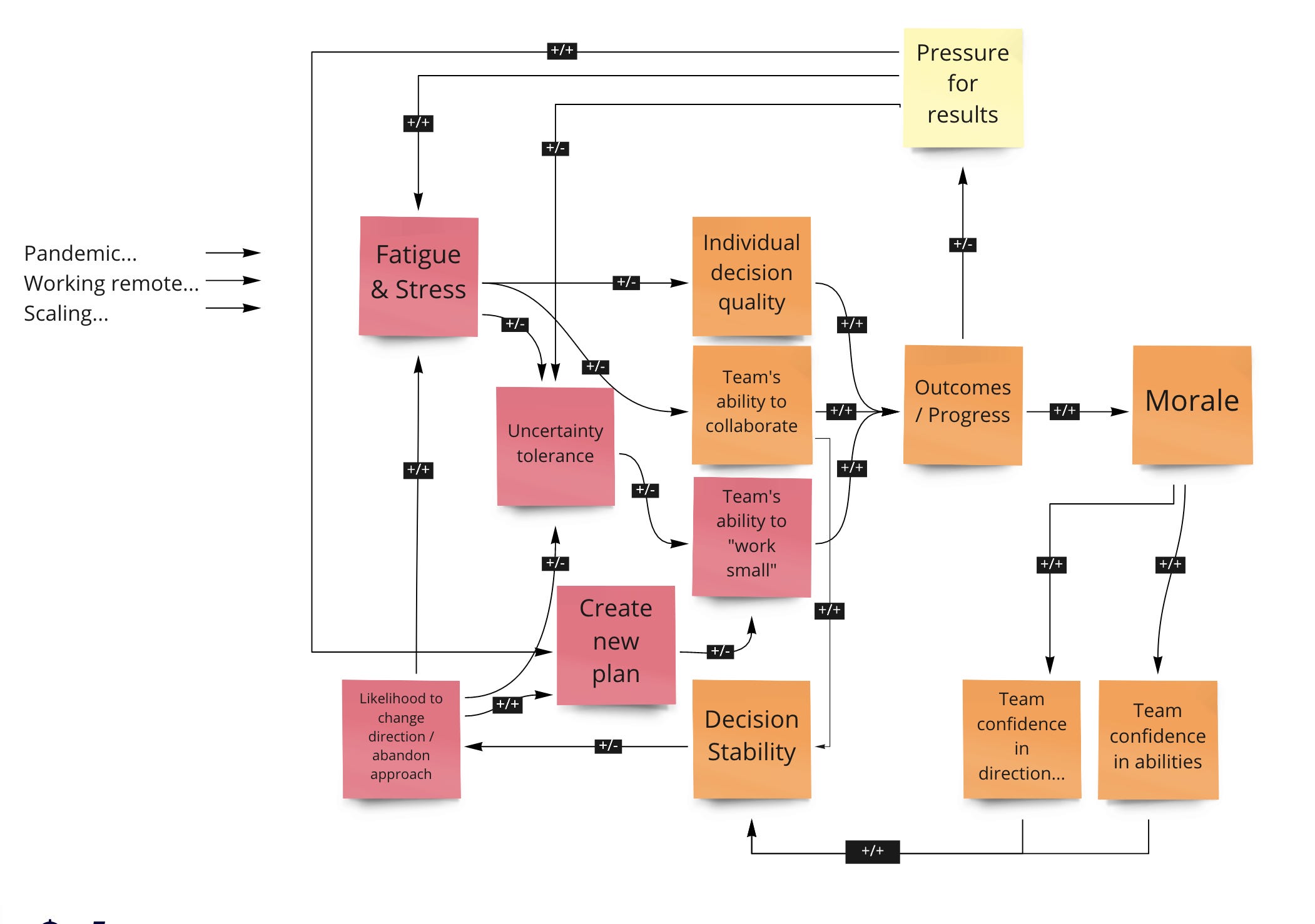 Let’s not forget what tends to happen when outcomes and progress suffer: increased pressure for results. Fatigue and stress increases. Uncertainty tolerance drops. And there’s pressure for a shiny new plan. As you might have guessed…this completes our loop. Decision quality drops. Collaboration suffers. And the team is more likely to tackle the new plan as a big batch of work.